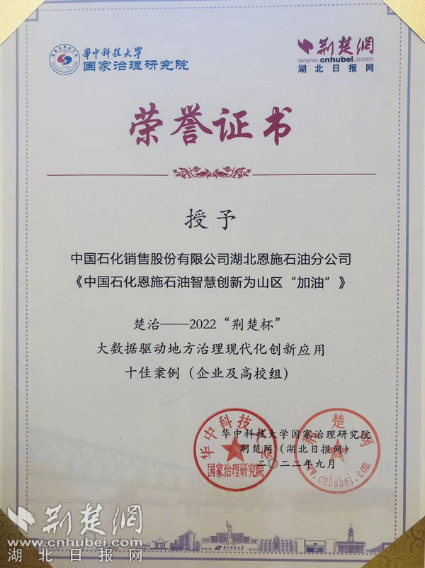 荆楚网(湖北日报网)讯(记者 谢翔)9月15日上午,楚治——2022“荆楚杯”大数据驱动地方治理现代化创新应用十佳案例评选活动在汉颁奖。中国石化销售股份有限公司湖北恩施石油分公司报送的案例《中国石化恩施石油智慧创新为山区“加油”》,荣获企业和高校组十佳案例。