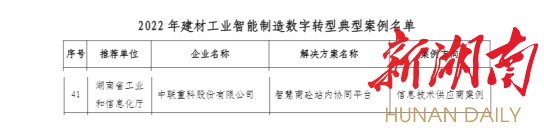 新湖南客户端9月15日讯(通讯员 李家宇)近日,国家工信部原材料工业司发布了2022年60个建材工业智能制造数字转型典型案例。由中联重科中科云谷研发和运营的智慧商砼站内协同平台入选上榜,是湖南省唯一上榜案例。