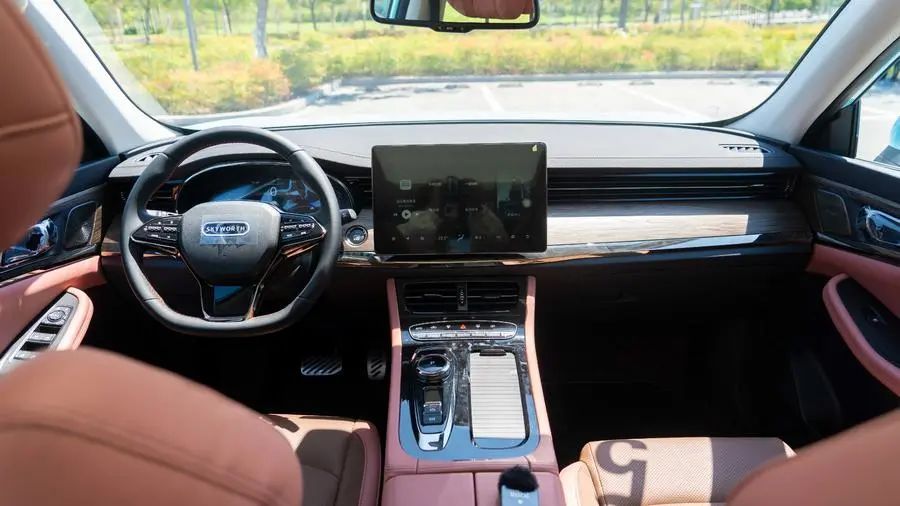 内饰方面,创维HT-i符合时代应有的潮流,且营造了不错的豪华感,12。3英寸的全液晶仪表盘、以及12。8英寸的中控屏,都有着出色的显示效果与功能性,而中控台使用的暗木纹装饰板,虽然并非真正的木质材料,但却有着极为细致的触感。