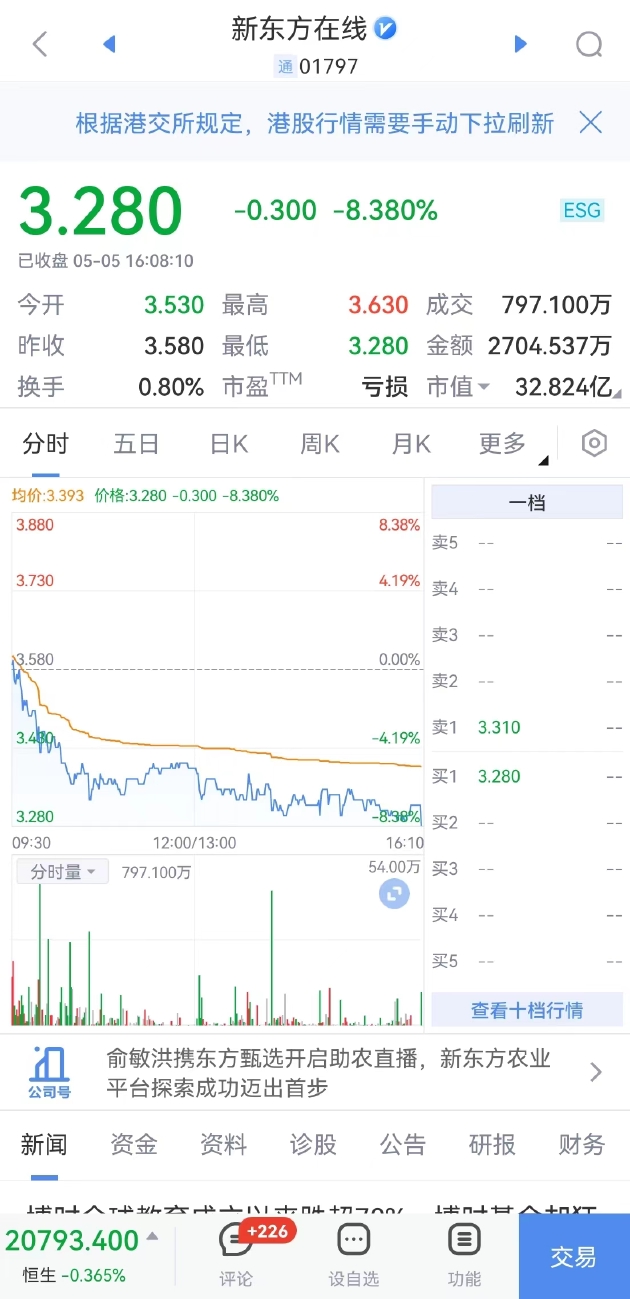 5月5日下午消息,香港恒生指数小幅收跌0。36%,恒生科技指数跌0。14%。新东方在线%,中兴通讯、有赞跌超3%。