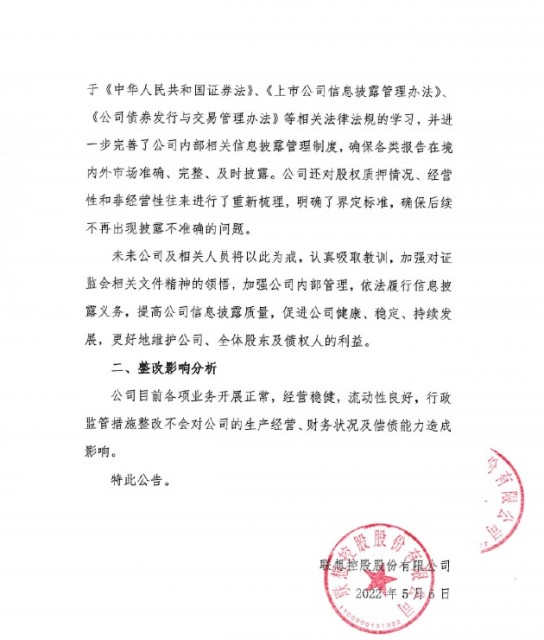联想控股在公告中还表示,目前各项业务开展正常,经营稳健,流动性良好,行政监管措施整改不会对公司的生产经营、财务状况及偿债能力造成影响。