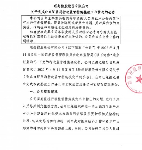 5月7日消息,联想控股发布公告表示,针对2022年4月14日收到的北京证监局下发的行政监管措施决定书,已经按照要求完成相关整改工作并已向北京证监局提交书面整改情况报告。