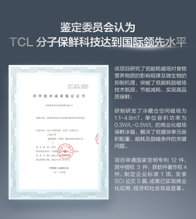 2022年8月15日,TCL-江南大学保鲜技术创新联合实验室正式揭牌成立。TCL家电品牌与江南大学等单位合作研发的“分子保鲜科技”,得到中国轻工业联合会和多位院士专家的认可,并获得“国际领先水平”认证。该技术突破诸多技术壁垒,实现了磁保鲜在家用冰箱上的应用,完成了首个磁保鲜冰箱——TCL格物系列冰箱C10-SS的开发。