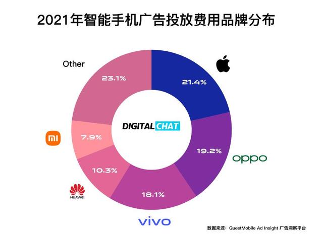 QuestMobile数据显示,2021年国内市场,智能手机厂商们的广告费占比情况。其中,苹果的广告费用占所有份额的21。5%,排第一。之后再是OPPO、比例为19。2%,而VIVO是18。1%。第四名是会为,比例为10。3%,不到苹果的一半。
