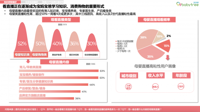 从内容形式发展趋势来看,母婴人群对简单易懂、专业人士推荐、真实评测等知识类及种草广告形式接受度更高。其中90后更青睐简单易懂的内容,80后更看重实操性。同时,随着直播形式的流行,看直播正在逐渐成为宝妈宝爸学习知识、消费、购物的重要形式。受访的母婴人群中,88%的人每周看2次以上直播;三线后是直播粘性最高的群体。