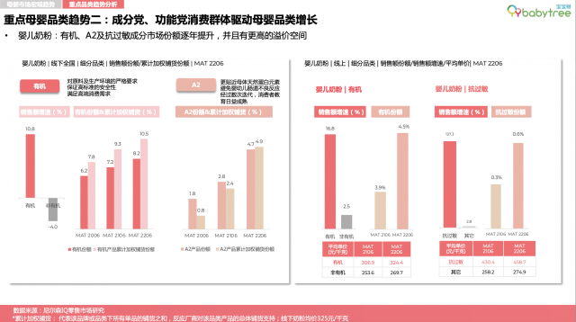 趋势二:“成分党”、“功能党”消费群体成为母婴品类增长的驱动力。随着消费升级和健康意识的增强,母婴人群知识文化水平提升,涌现出越来越多爱学习和研究的“成分党”、“功能党”宝妈。有机、A2、抗过敏成分奶粉市场份额逐年提升,并且有更高的溢价空间。例如线下渠道中,有机奶粉销售额增速达10。8%,而非有机奶粉销售额增速为-4%。在线元,有机奶粉的增速高达16。8%,远高于非有机奶粉的2。5%增速。总体来看,集中突出成分、材料和功能优势是线上母婴产品热卖的关键词,备受“成分党”和“功能党”宝妈的追捧。