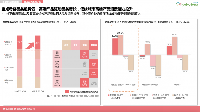 趋势四:低线城市高端产品消费能力拉升。高端产品在全渠道增长明显。2021年6月至2022年6月期间,高价位奶粉在低线城市母婴店涨幅喜人,高端(均价390-520元/千克)及超高端奶粉(均价≥520元/千克)销售额分别增长29。4%、24。3%。线上渠道超高端奶粉增长达73。5%;高端及超高端纸尿裤增长率为19。4%(均价≥2。16元/片);高端/超高端婴儿护肤品(均价≥324元/千克)增长率29。6%。