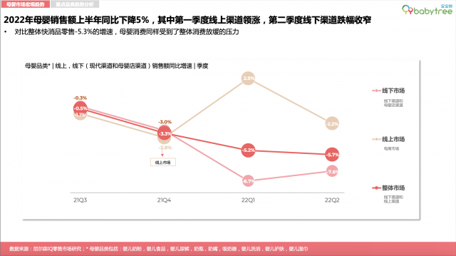 报告显示,尽管2022年上半年,整体快消品零售市场增速放缓,母婴销售额同比下降5%,但线下母婴店渠道三年复合增长率达1。8%。低线城市人口红利优势明显,母婴消费额占比不断上升,成为线下母婴渠道的主力市场。一季度线%的增长,主要抢占商超等线下现代渠道份额。其中婴儿奶粉、婴儿护肤、吸奶器三大品类线上增长强劲,未来可期。尤其奶粉品类在线上渠道基数低、增速快,有较强潜力。