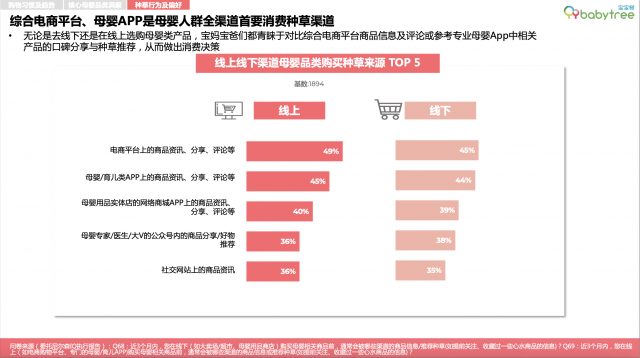 无论是在哪里购物,宝妈宝爸都倾向于先在网上查看好相关产品的信息和评论推荐,再做消费决策,综合电商平台、母婴类App成为母婴群体购物时最重要的消费种草渠道。真实口碑、强专业度以及符合阶段需求的精准推荐是母婴App商品种草内容受青睐的主要原因。消费品类中奶粉、洗护、尿裤、化妆品、婴幼儿食品是母婴App种草效率最高的品类。