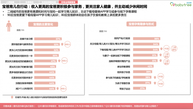 新一代宝爸承担育儿责任的意愿日益增加。其中,收入较高的宝爸更愿意主动减少个人休闲时间积极参与家务,也更关注家人健康;二线城市的宝爸则更有意愿和时间与宝妈一起学习育儿知识;90后宝爸倾向于下载母婴App学习育儿知识;80后宝爸群体则会在孩子饮食和教育上承担更多。