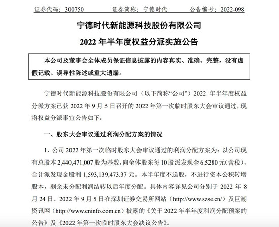 9月22日消息,宁德时代公布2022年半年度权益分派实施公告,以公司现有总股本2,440,471,007股为基数,向全体股东每10股派发现金6。528元(含税), 合计派发现金股利约15。93亿元。