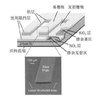 在利用R1SE工艺生产太阳能电池过程中,利用激光加工方法在太阳能电池背面制作出交叉图形发射区和基区,激光烧蚀还能使自对准接触层在金属蒸发后可靠地分离(参见图1)。非接触式加工(对减少晶片损伤非常重要)首先利用口开关三倍频355 nmNd!YVO4激光器在晶体硅晶片背面的氮化硅或者氧化硅薄层中烧蚀出呈指状交叉的发射区和基区图形。晶片的任何损伤都会缩短载流子的寿命,同样也会降低光一电转换效率。然后利用氢氧化钾(KOH)腐蚀加工以去除激光加工所导致的损伤部分。经过腐蚀之后,发光物质扩散形成发射区,剩下凸起的氮化硅和氧化作为基区。在湿法化学腐蚀之前,下一步加工工序是利用金属蒸发自对准接触层分离加工来分离发射区和基区。