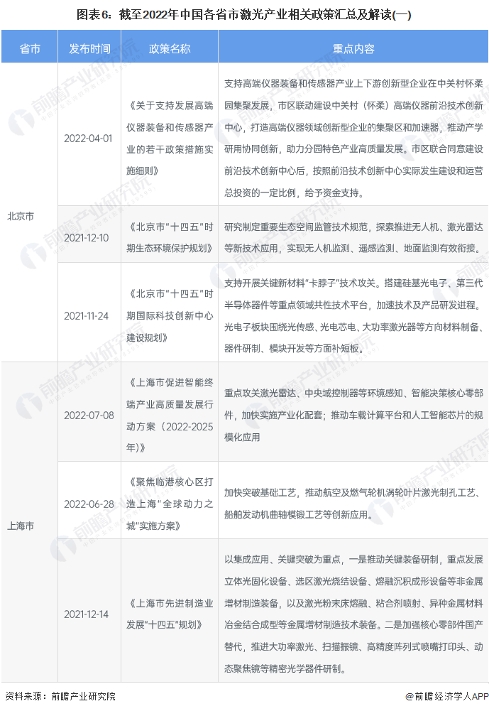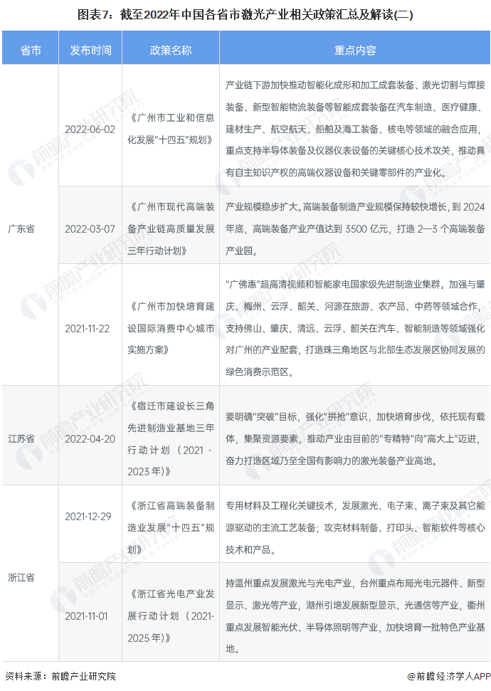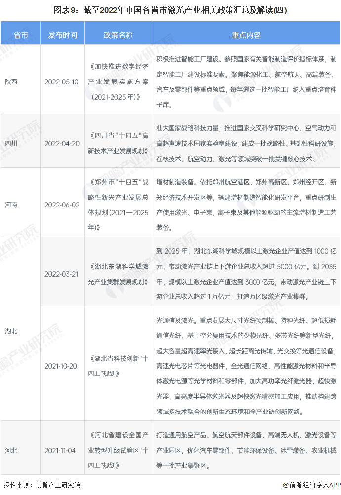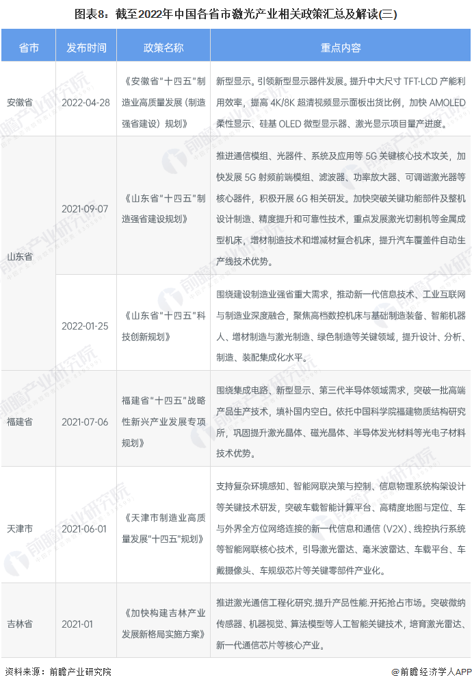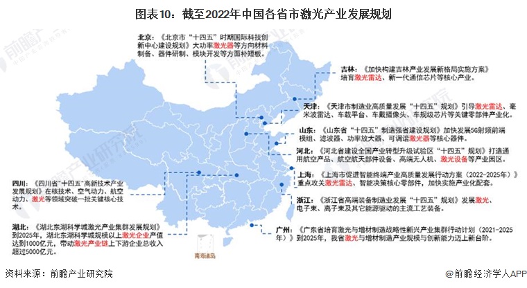 从各省市的激光产业发展政策来看,湖北省由于是全国激光产业发展较为成熟企业,湖北省对激光产业链2025年有明确的收入指标;广东省、浙江省等省级行政区对于激光产业发展做出了明确规划和指示;北京市、山东省做出了对发展激光器的规划;河北省提出要建设激光设备产业园区;吉林省、天津市、上海市对激光雷达的发展有较好的政策指导。