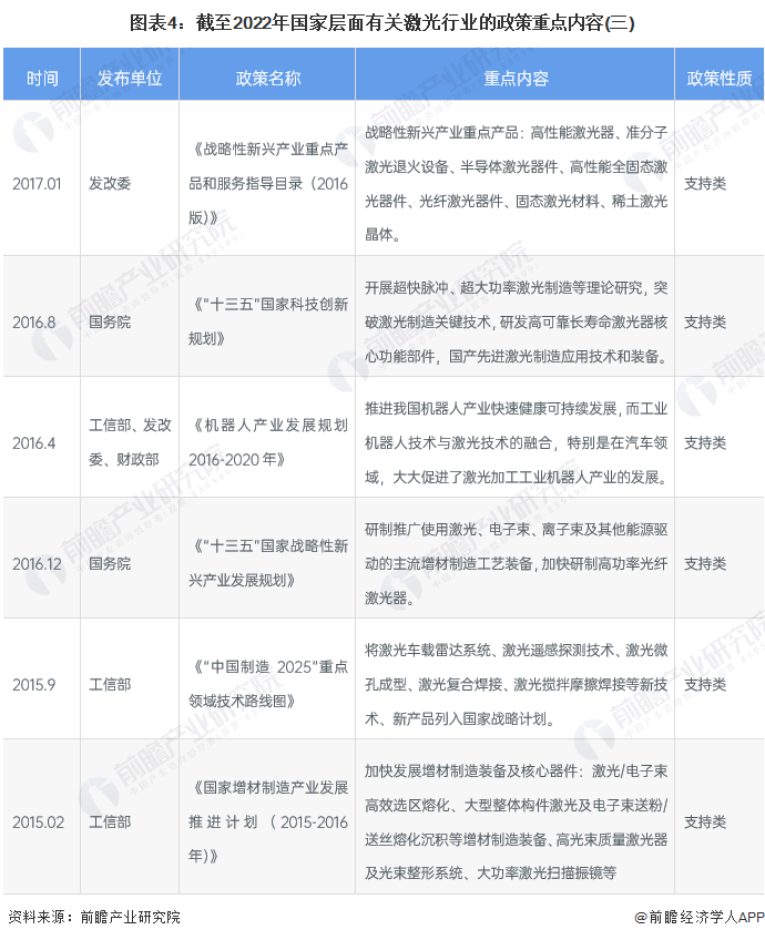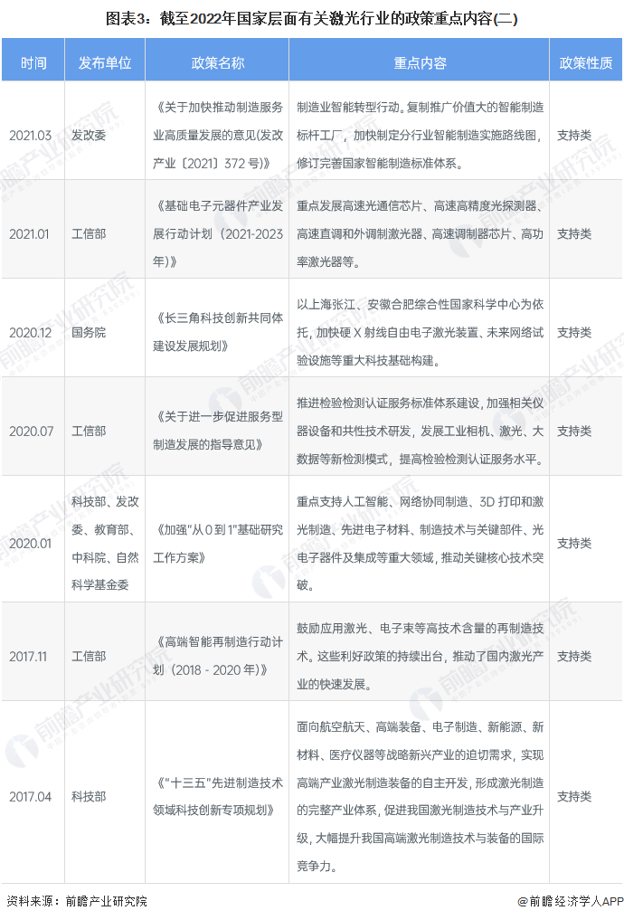 激光行业作为战略性新兴产业,国家不断出台相关政策对行业的发展进行支持。我国政策规划主要鼓励激光企业通过自主创新掌握核心技术,促进激光技术与高端制造深度融合,构建完善的激光制造产业体系。