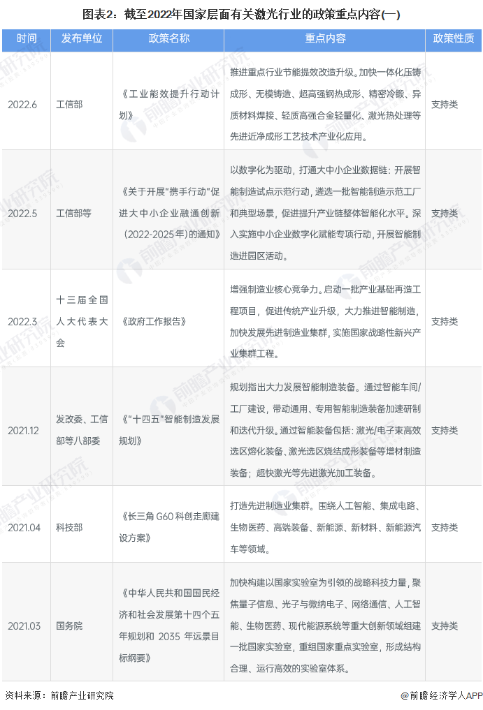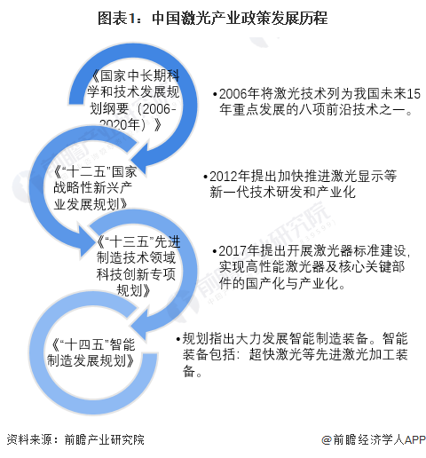 我国在政策上给予激光产业发展的支持力度逐年增强。2006年我国发布《国家中长期科学和技术发展规划纲要(2006-2020年)》首次将激光技术列为我国重点发展的前沿技术;《“十二五”国家战略性新兴产业发展规划》中指出要加快推进激光显示产业化;《“十三五”先进制造技术领域科技创新专项规划》中提出要实现高性能激光器的国产化;2021年《“十四五”智能制造发展规划》中指出要大力发展包括先进激光加工设备等的智能制造装备。
