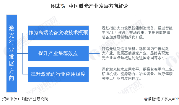 在激光产业发展方向上,从政策制定的角度来看,技术突破、产业发展和应用扩展是主要内容。在激光产业技术进步上,我国将加速智能制造装备的研制和迭代升级,对激光产业来说是良好的政策机遇;在产业发展上,我国激光产业的发展目标是达到先进国家同等水平,打造激光产业集群;在应用扩展上,激光产业将加强与医疗健康、工业制造等方面的应用,最终在重点领域实现批量化应用。