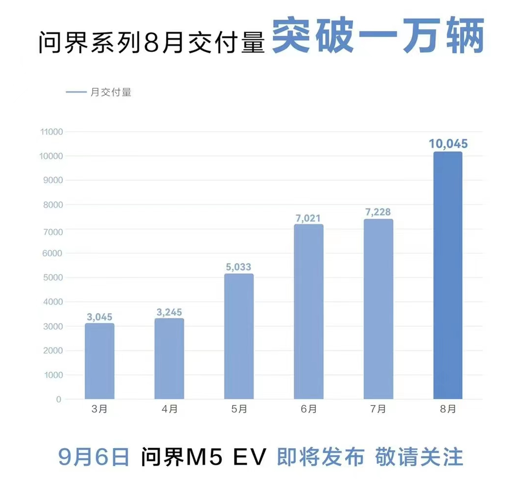 有华为加持的AITO问界,则是8月新势力销量榜单中最亮眼的存在。赛力斯发布的产销公告显示,8 月新能源汽车销量1.46万辆,同比增长310.77%;其中AITO问界系列交付量达到10,045辆,这也是AITO自上市以来,首次实现单月销量破万的成绩。