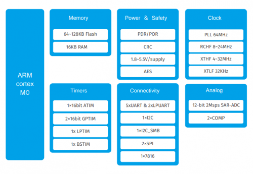 该系列MCU是基于ARM Cortex-M0内核的32位低功耗MCU芯片,最高主频为64MHz,提供最大128KB FLASH程序存储空间,搭配 16KB RAM;片上集成LCD驱动、带温补的RTC、SAR-ADC、AES加密,以及丰富的通用外设接口;支持多种封装形式,包括:LQFP64/ LQFP48/ QFN32/ TSSOP24。 其主要特性如下: