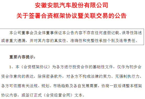 9月6日晚,安凯客车公告称,公司与江淮汽车、弗迪电池和浙储能源,就动力电池的合作事宜,签署了《合资框架协议》。