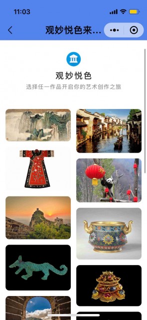 “观妙悦色”小程序内的17件代表性作品涵盖历史文物和古迹、手工艺品、现代艺术作品等多个类别,其中来自乌镇的水阁线图、司马台长城的夏季景色线图和iPanda熊猫频道的“国宝”底片,将中国文化和艺术的美通过数字化方式传递给本地和全球用户。