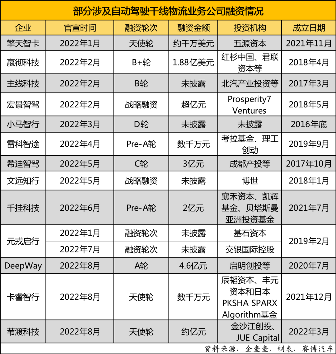 据不完全统计,2022年前8月,涉及干线物流业务的自动驾驶公司融资事件大约有14起,包括13家企业。金额方面,由于部分公司未透露具体金额,初步估算约为数十亿元。