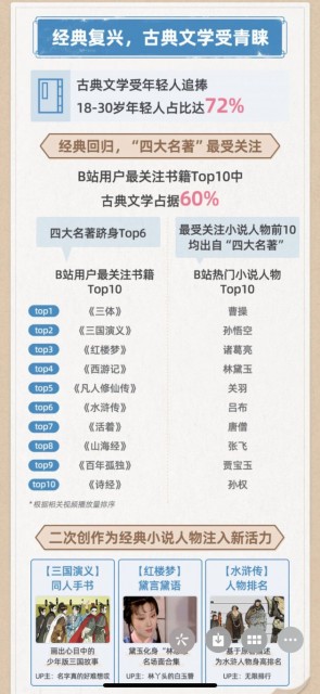 在国学热的大潮影响下,古典文学内容开始广受年轻人青睐,报告显示,最受关注的书籍Top10中,60%为古典文学,四大名著跻身前六。同时,孔子成为B站最具增长潜力的人物,去年一年中关于孔子的视频增速达585%,多个百万爆款视频,不少UP主从孔子的生平、六艺齐全、力大无穷等角度入手,广搜史料挖掘文献,发现了他是最早的六边形战士,凸显出他与大众认知中的反差萌。