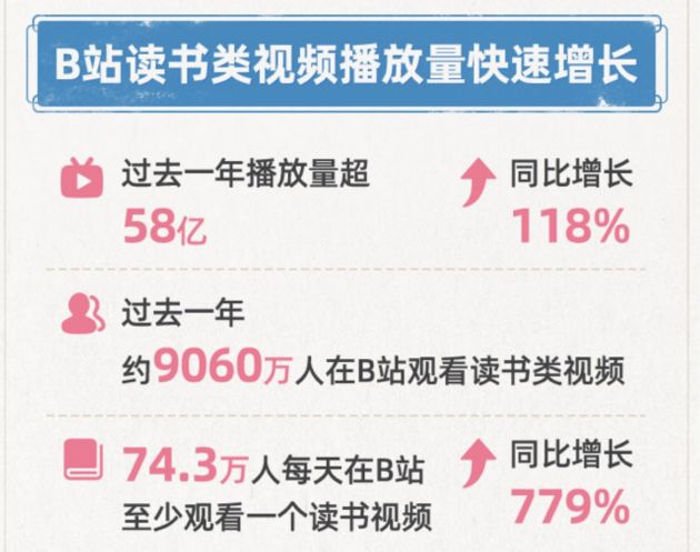 除直播分享外,B站今年推出了《BILIBILI读书生态报告》,读书品类内容在B站快速增长,过去一年,读书类视频总播放量超58亿,约9060万人在B站观看读书类视频,其中74。3万人每天在B站观看一个以上的读书视频,同比增长779%。