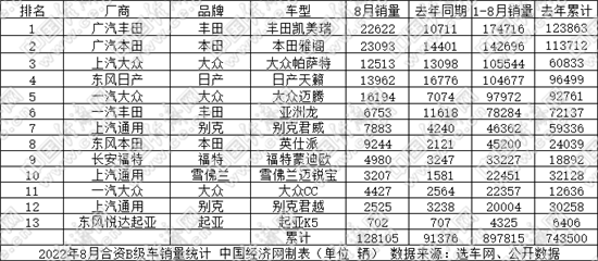 2022年8月合资B级车销量统计