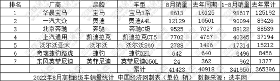 2022年8月高档B级车销量统计