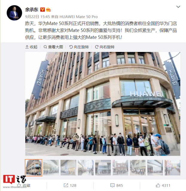 9 月 23 日消息,9 月 22 日,华为常务董事、终端业务 CEO、智能汽车解决方案事业群 CEO 余承东在微博发文称,“9 月 21 日,华为 Mate 50 系列开启销售,大批热情的消费者前往华为门店购机。非常感谢大家对 Mate 50 系列的喜爱与支持,华为会抓紧生产,保障产品供应,让更多消费者用上 Mate 50 系列手机。”