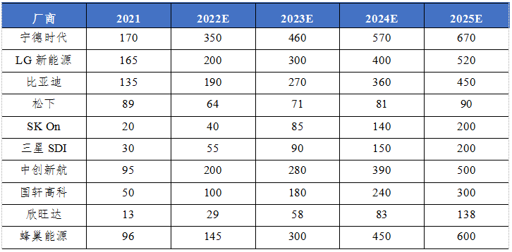 图表2:全球主流动力电池厂商产能规划(单位:GWh)