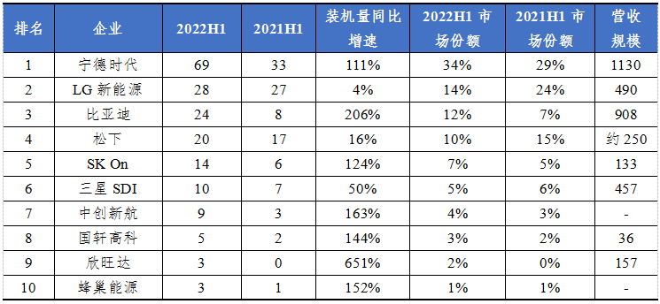 图表1:2022年上半年全球动力电池装机量TOP10(单位:GWh,%,亿元)