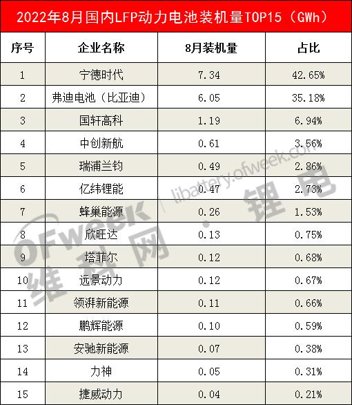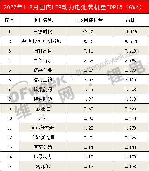 先看第一榜:8月国内磷酸铁锂动力电池企业装机量TOP15。