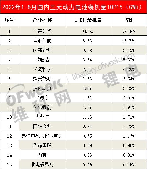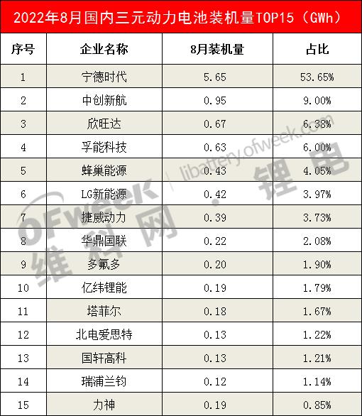 再看第二榜:8月国内三元动力电池企业装机量TOP15。