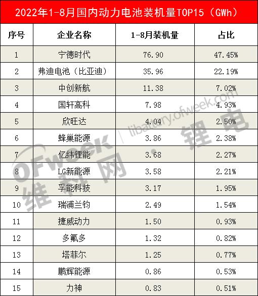 第六榜:1-8月国内动力电池企业装机量TOP15。