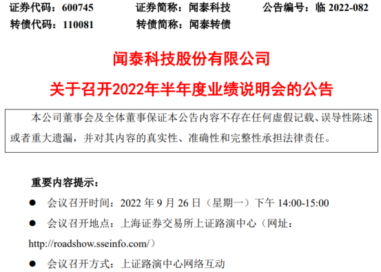 近日,闻泰科技发布公告称,公司将于9月26日14:00-15:00以上证路演中心网络互动的形式,在上海证券交易所上证路演中心召开2022年半年度业绩说明会。