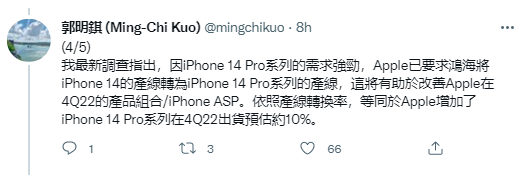 9月20日讯, 知名苹果分析师郭明錤最新发文指出,由于iPhone 14 Pro的需求强劲,苹果已要求鸿海将iPhone 14的生产线 Pro机型,相当于将第四季度iPhone 14 Pro出货量预测提升10%左右。