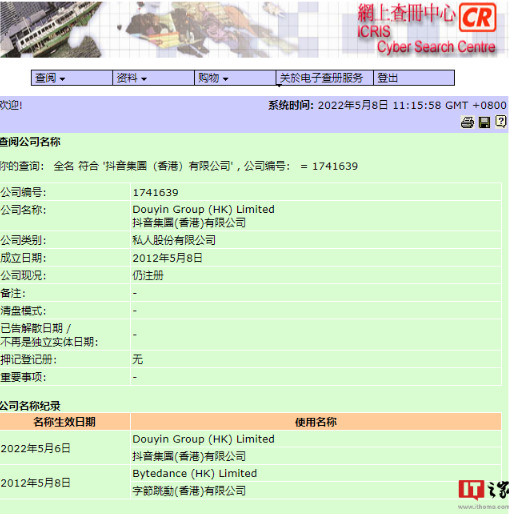 5 月 8 日消息,据新京报贝壳财经消息,通过查询香港公司网上查册中心获悉,2012 年注册成立的字节跳动(香港)有限公司已经于今日更名为抖音集团(香港)公司,该公司旗下共有三位董事,分别为字节跳动 CEO 梁汝波,以及莫肇棋和张鹏,公司性质为私人股份有限公司。