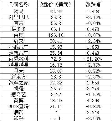 中概电商龙头股多数下跌,阿里巴巴下跌2。12%,京东下跌0。04%;拼多多上涨0。47%。