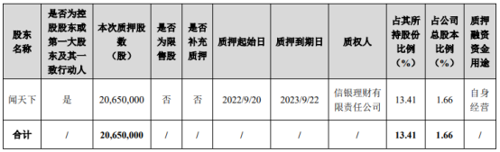 公告显示,闻天下共持有公司股份数量为153,946,037股,占公司总股本比例为12.35%。累计质押82,590,000股股份,占其所持有股份比例为53.65%,占公司总股本比例为6.63%。