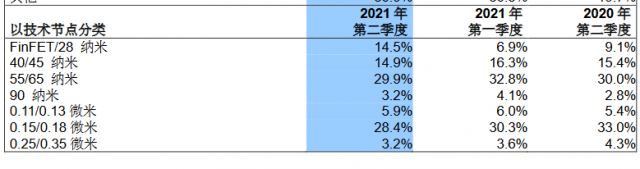 在2021年第二季度财报中,原有的14/28 纳米变更为了FinFET/28 纳米。按照业界的标准,例如14nm,台积电的7纳米、5纳米工艺都采用了FinFET结构。也就是说众多先进工艺均可以归属到FinFET这个分类下。这次变化可能与中芯国际的N+1工艺有关,从业界的标准来看N+1工艺不属于14纳米,但可以划分到FinFET这个分类下。