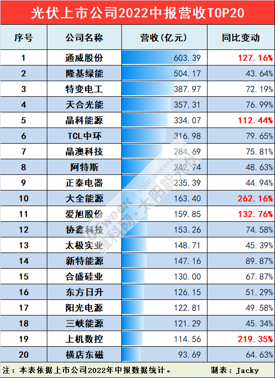在营收增幅方面,今年上半年,上述20家企业的营收同比增速均较快。其中,通威股份同比增幅高达127。16%,大幅领先隆基绿能的43。64%,助其后来居上,首次超越后者登上了该榜榜首;而增速较快超过100%的企业还有大全能源(262。16%)、上机数控(219。35%)、爱旭股份(132。76%)和晶科能源(112。44%)。