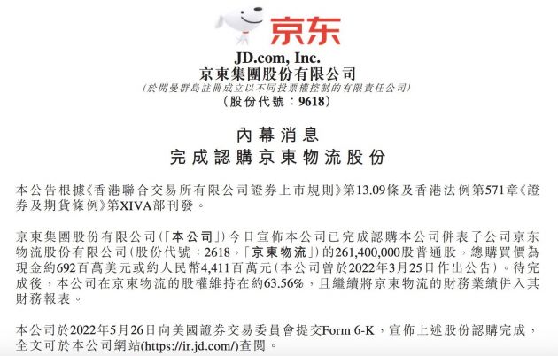 5月27日消息,京东集团在港交所发布公告,公司已经完成认购并表子公司京东物流2。614亿股普通股,总购买价为现金约6。92亿美元(约人民币44。11亿元)。待完成后,本公司在京东物流的股权维持在约63。56%,且继续将京东物流的财务业绩并入其财务报表。