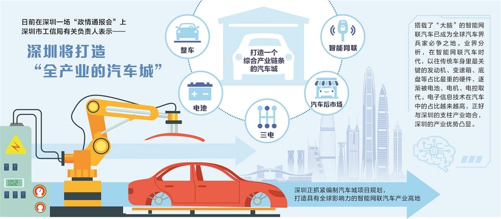 深圳是全国制造业强市,整体的工业结构较轻,以电子信息产业为主,因此,一直以来大家对深圳发展汽车工业抱有疑虑。然而,进入智能网联汽车时代,“全产业汽车城”的内涵焕然一新,给深圳打开新的机遇之窗。