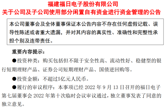 据悉,福日电子拟投资金额不超过5亿元人民币,购买包括但不限于安全性高、流动性好、稳健型的银行短期理财产品、证券公司短期理财产品、国债逆回购,相应理财资金来源全部为自有闲置资金,投资期限为2022年9月13日至2022年12月31日。在此期限内,5亿元人民币额度可以滚动使用。