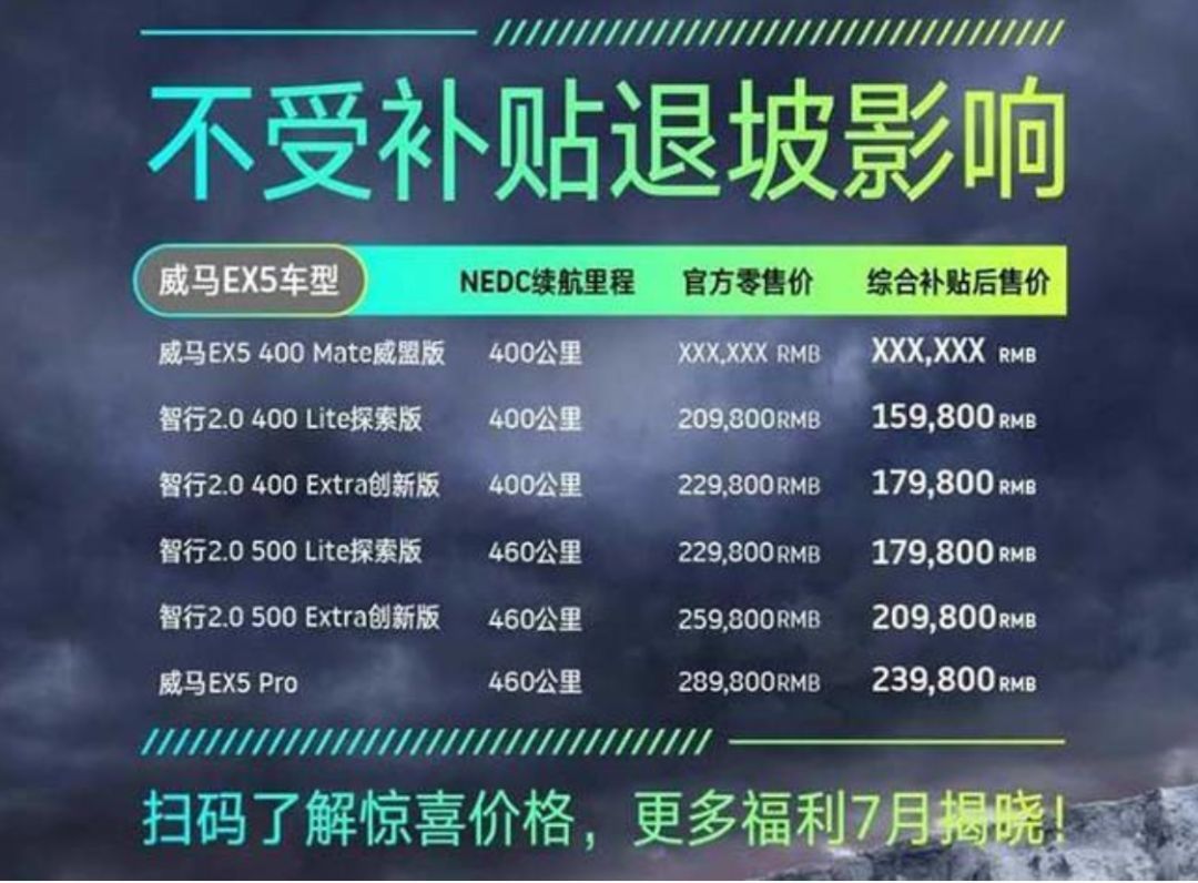 6月25日,威马汽车率先公布了“保价“政策。该公司宣布旗下EX5车型不受补贴退坡影响,依然按照现行成交价销售。目前,威马EX5共有5款在售车型,零售价区间为20。98万-28。98万元,按照现行补贴政策,综合补贴后售价为15。98万-23。98万元,6月25日后,EX5售价将维持目前补贴后售价不变,依然为15。98万-23。98万元。威马汽车董事长沈晖也表示,威马汽车根据用户的反馈和市场的需求,暂不调整产品的售价。
