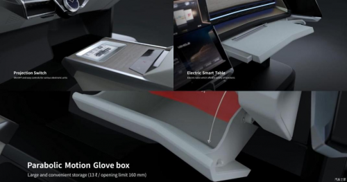 副驾带有可伸缩的平板电脑可通过中控区控制,并且配有集成键盘的智能桌板,可供副驾在车中办公。