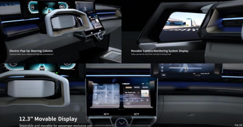 不少部件是可移动的,如12。3英寸的中控屏和流媒体后视镜的监控屏。方向盘则可以缩回,以供提高驾驶员的腿部空间。