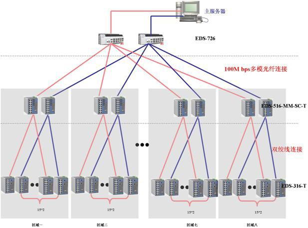 奥运场馆水立方艺术灯光景观项目的网络架构图所示:网络采用双网架构,分为三层。设备层由188台EDS-316-T交换机组成,主要负责连接现场的LED灯光控制器,控制景观灯的开关和颜色。汇聚层由16台EDS-516A-MM-SC组成,负责连接现场层的EDS-316-T。核心层使用两台EDS-726模块化交换机组成,负责连接汇聚层的EDS-516A-MM-SC和服务器。