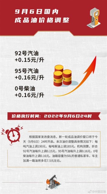 据中国石油官微,根据国家发改委消息,新一轮成品油调价窗口将于今天(9月6日)24时开启。